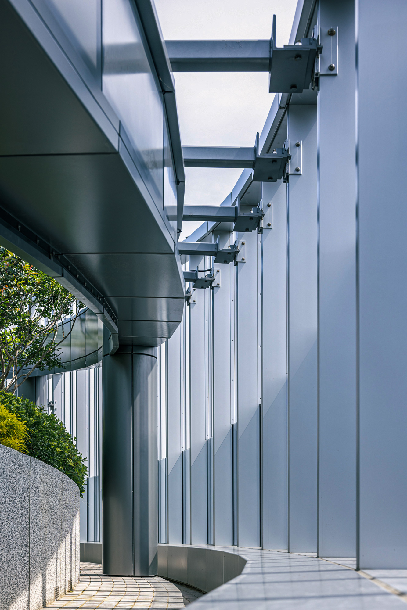 外觀東北面採弧形量體,呼應臺北表演藝術中心的球體造型,南面則採盒狀構造,