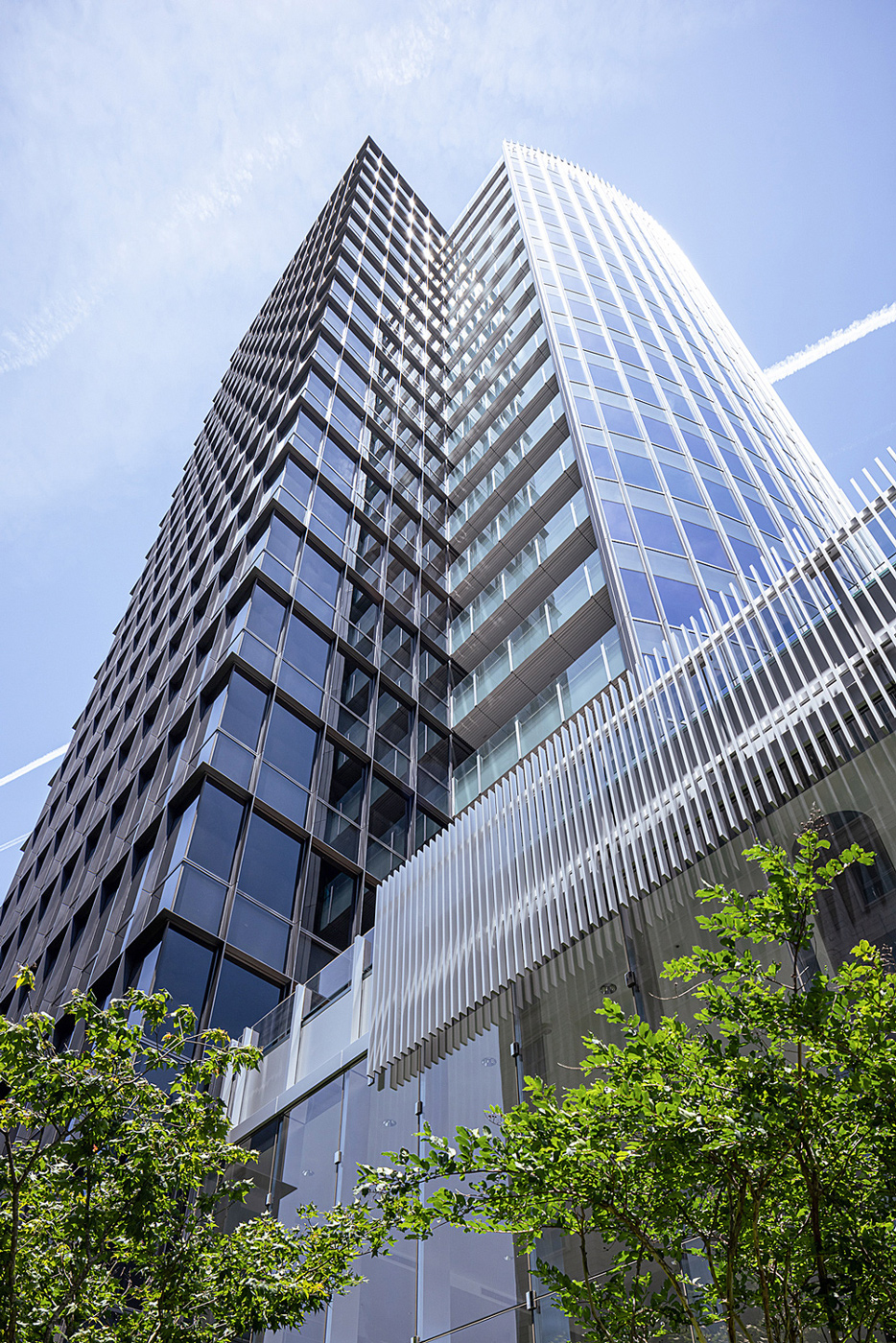 從地面層的微型森林到屋頂的天空綠洲,建築本體外牆系統則以垂直遮陽、複層Low-E玻璃構成,