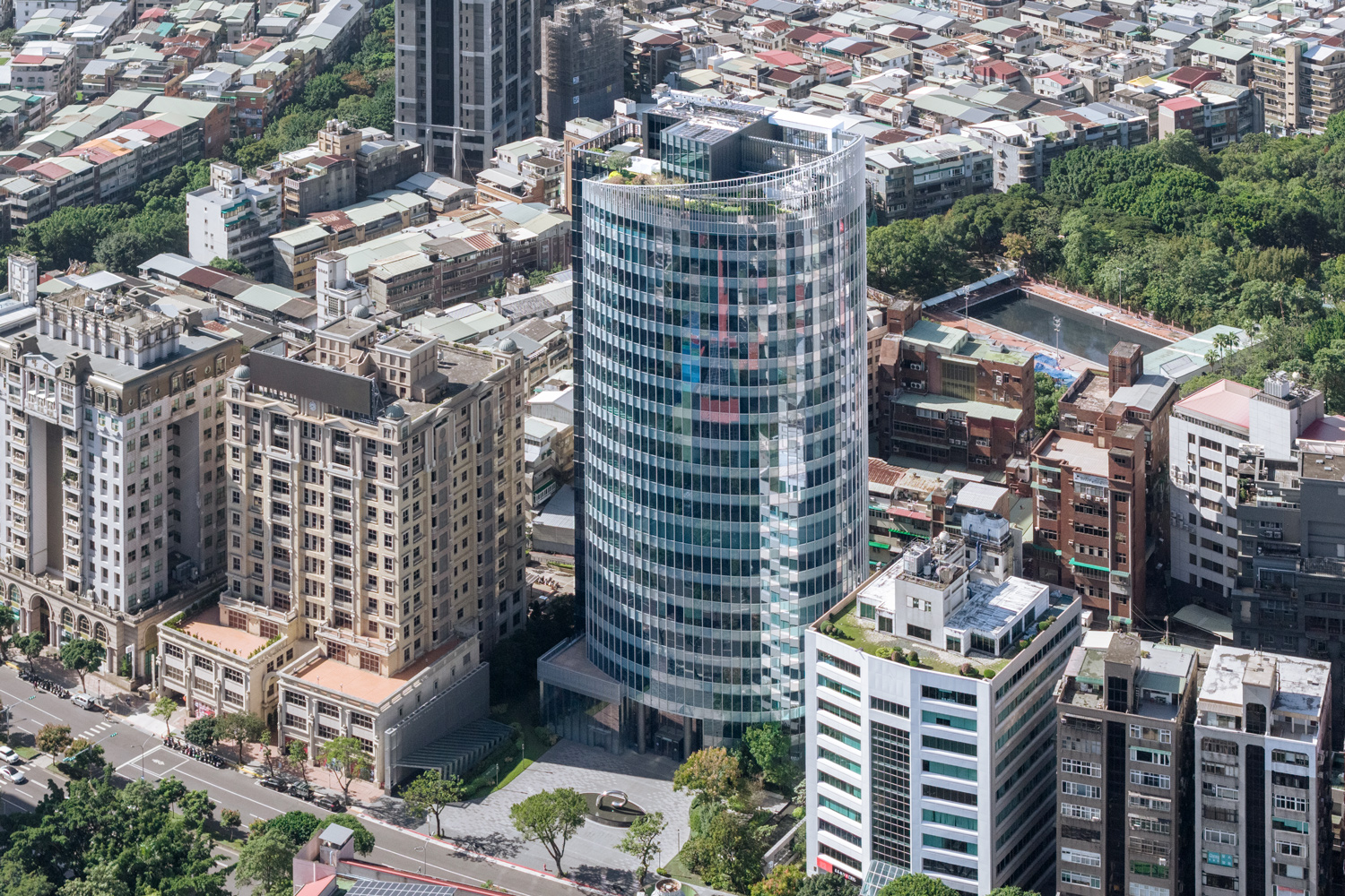 設計以綠意滲入城市為構想,基地以29%的建蔽率配置建築,留設大量的綠化開放空間,