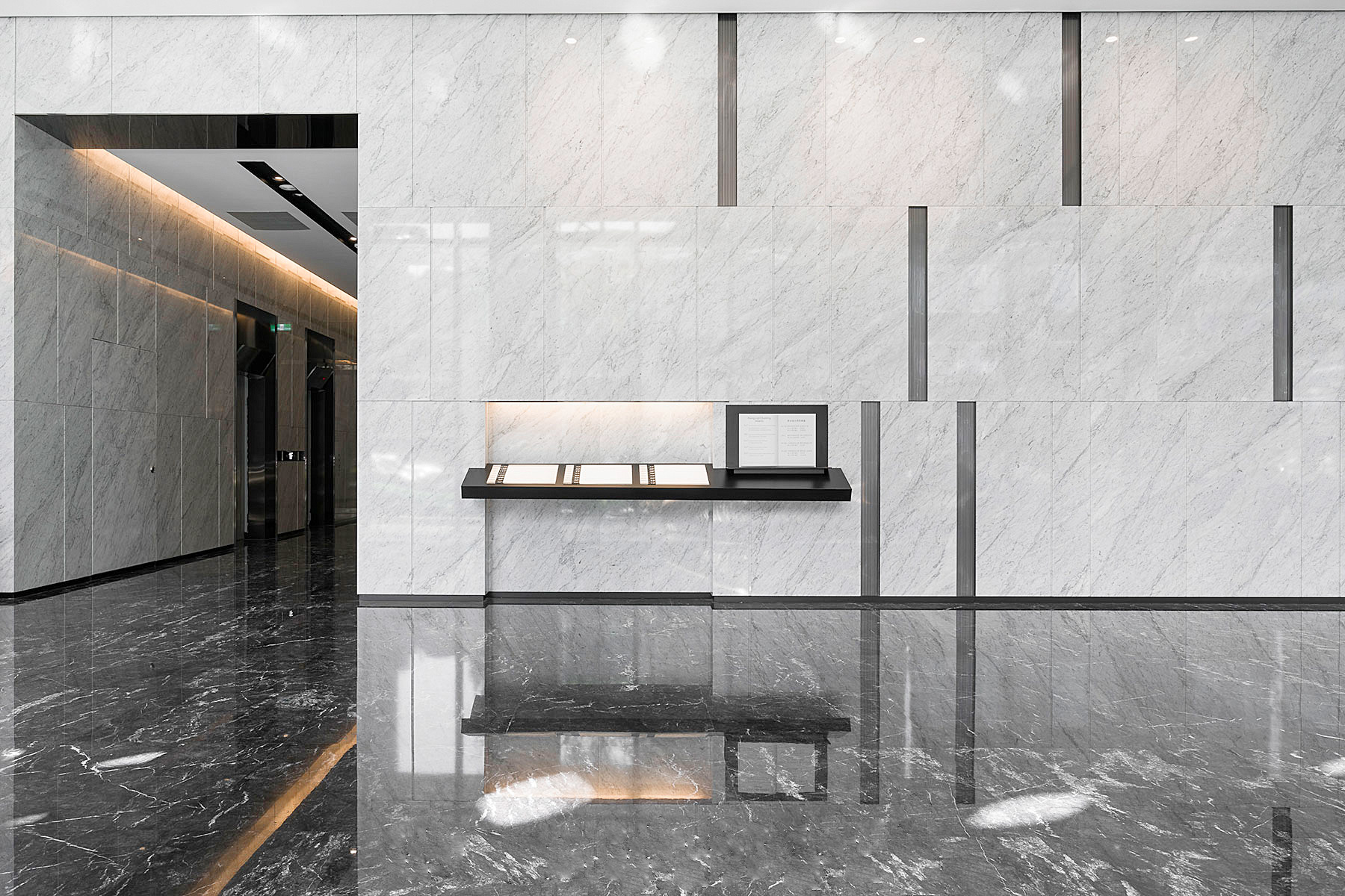 延續這份對城市的友善,入口大廳置於街角,以都市光盒打造建築與行人的開放介面。不銹鋼鏡面背板映照街景綠樹,陽光穿透葉形雨遮與大理石牆交織光影;夜幕降臨,雨遮投射的葉影覆落於廣場地面,消弭辦公大樓的冰冷印象,形成溫暖而親切的街角客廳。