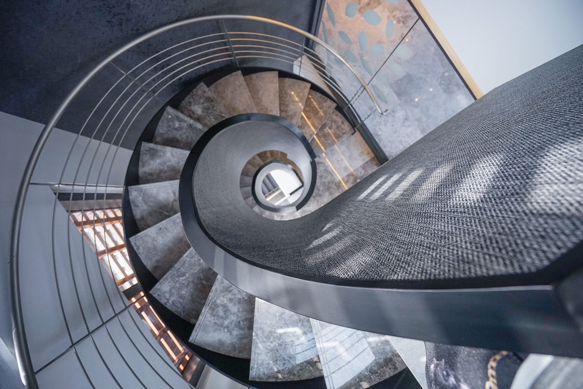 「科技之樹」作為核心原型,寄寓生命的庇蔭與滋養,以葉形遮陽板營造光影流動的一樓開放空間,並以垂直樹型遮陽板活化立面與街區關係。頂樓透空框架打造的空中花園為城市增添綠意,一座翡翠皇冠優雅而居。