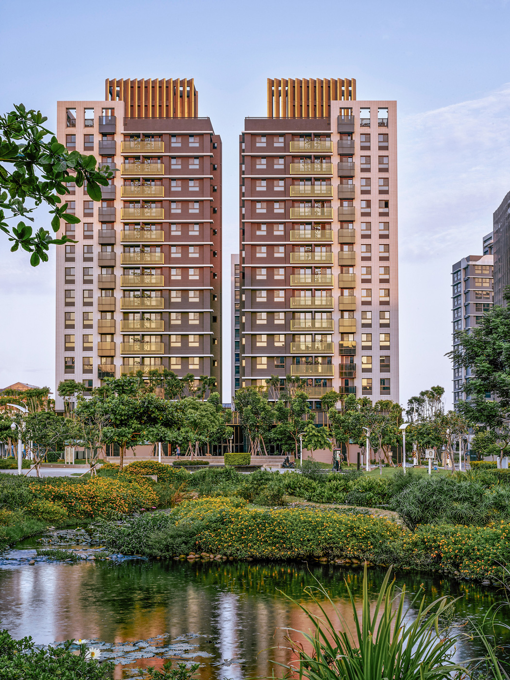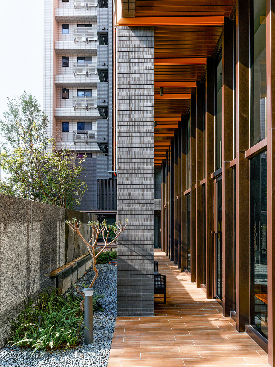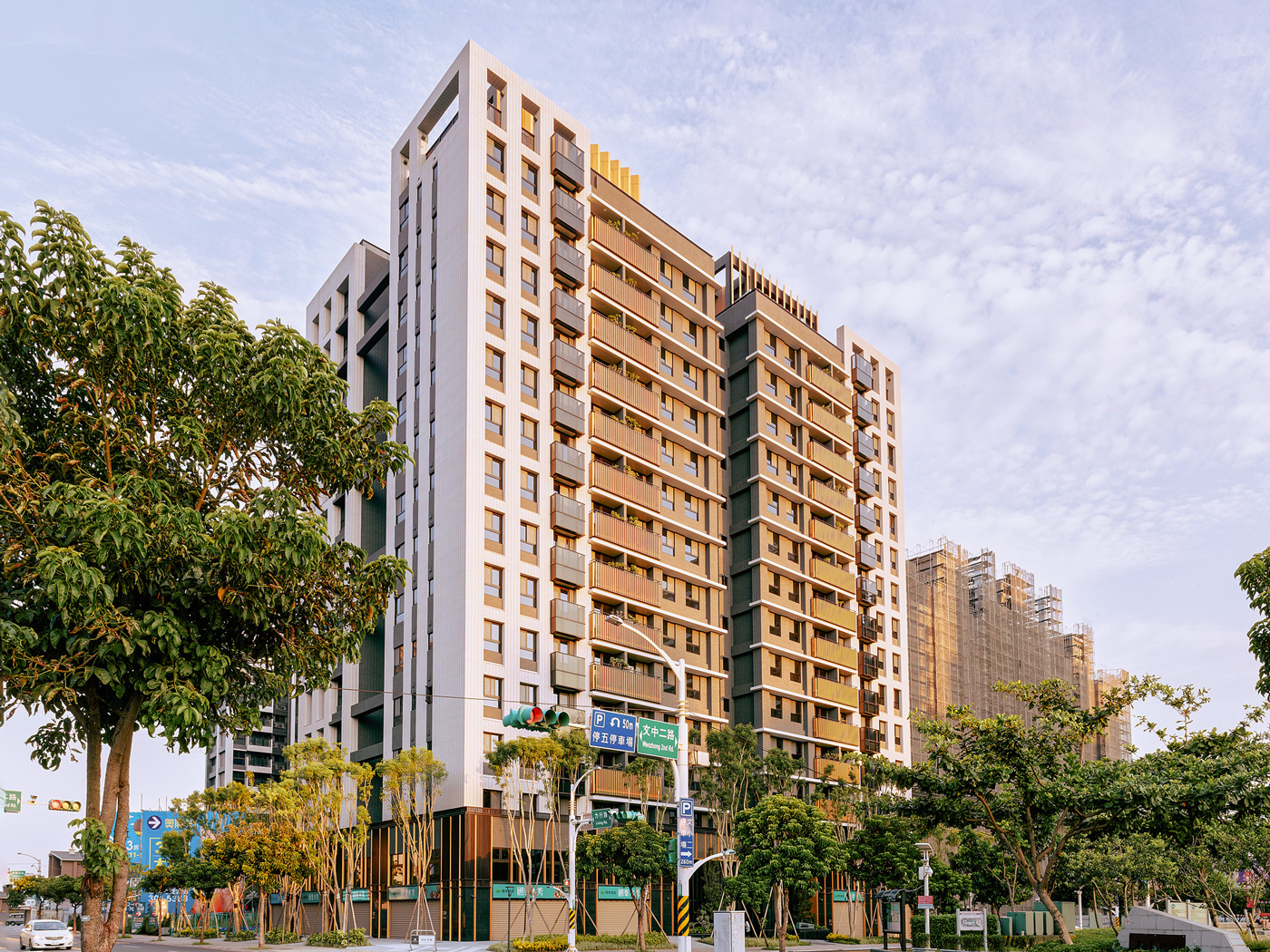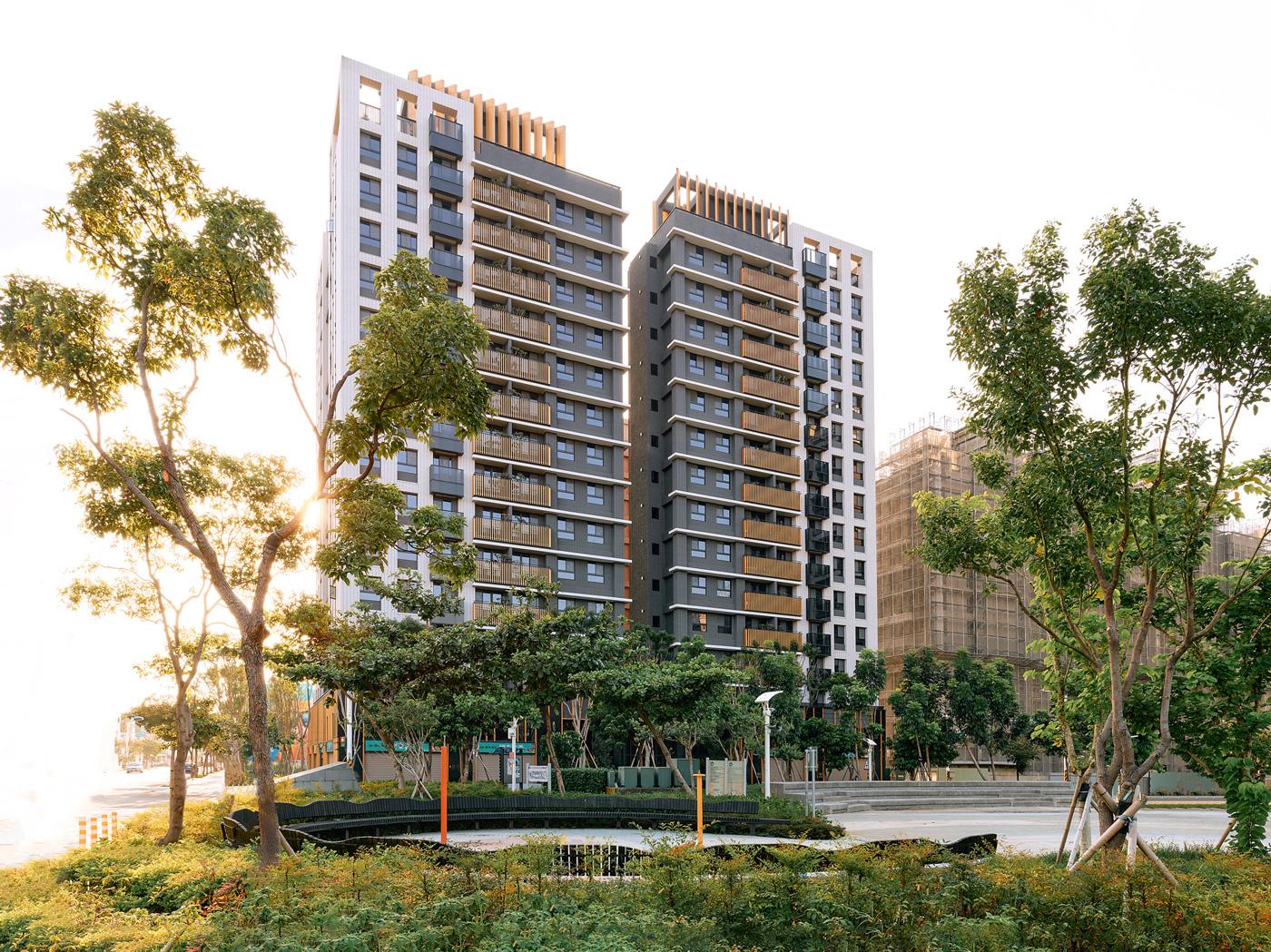 鄰里相知,自然相伴。 國泰建設於桃園中路二段打造的住宅大樓,擁抱水秀公園第一道林蔭,綠意自此綿延。「林蔭之城」作為靈感,將綠的形態與枝葉韻律向外延展,向上堆疊。錯落量體呼應丘陵起伏,彷彿林木在都市間層層生長。基地開放空間與行道樹緊密串連,通透的社區門廳與對街公園相映成景。一樓沿街配置一般零售,互補與公園相連的日常機能。在這裡,閱讀一段流動的風景,散步、購物、相遇自然發生。 共享而友善的生活,就在國泰水秀從容發生。