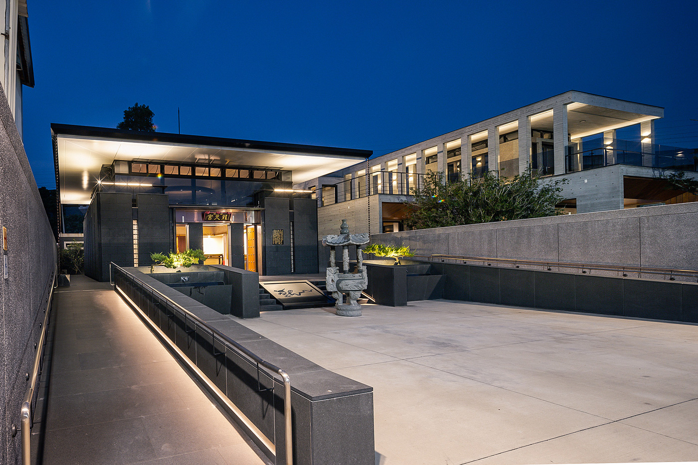 「天圓」則是指「天時」如六十甲子一般週而復始,時空的轉變時間的流逝,因此我們將建築結構體從板牆結構轉為鋼構,將屋頂架高透空,使太陽東生西落的同時光線透過玻璃打入室內,利用光影上的變化體驗著時間、感受人生。隨著太陽西下夜晚的來臨,我們在大殿頂端設計了環形燈具,除了燈具的機能外,也象徵著「天圓」(天上的光)。