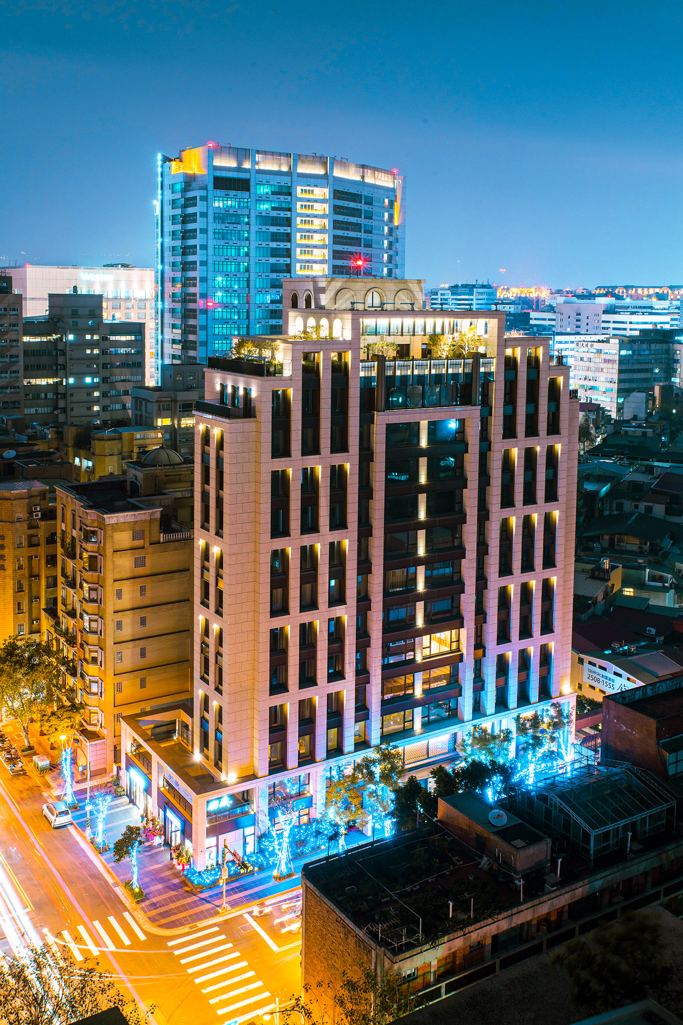 行人尺度上,藝術格柵沉穩銜接建築基座,弧形的入口雨庇呼應頂樓的橢圓燈箱。基座的仿古面石材,展現精品豪邸的獨特風華。