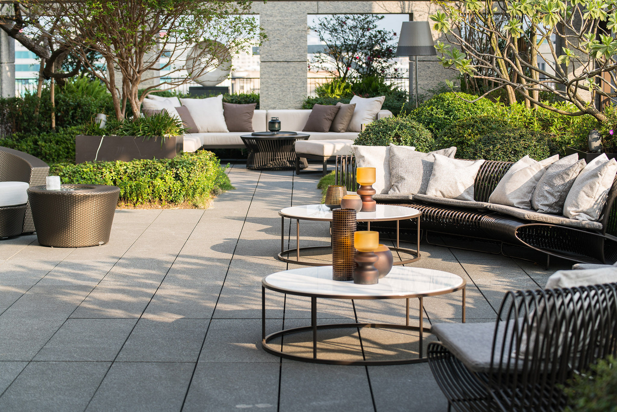 從都市尺度上,頂部南向的橢圓燈箱立面,鮮明勾勒華孚鈞藏獨有輪廓,自夜色中煥發珠光,溫暖指引歸家的住戶;屋頂的休憩花園,則為居者開拓一方專屬的空中靜地。立面細部以生活尺度為本,長型深凹窗兼顧採光與隱私,使窗景從容安定。