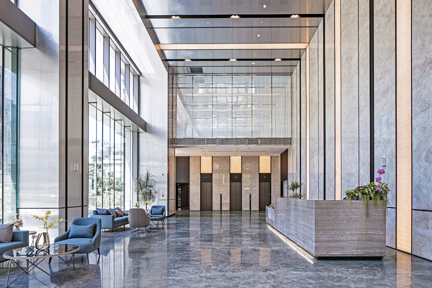 大廳的L型光帶與建築立面的跳躍線條融為一體,營造明亮俐落的現代科技氣息。