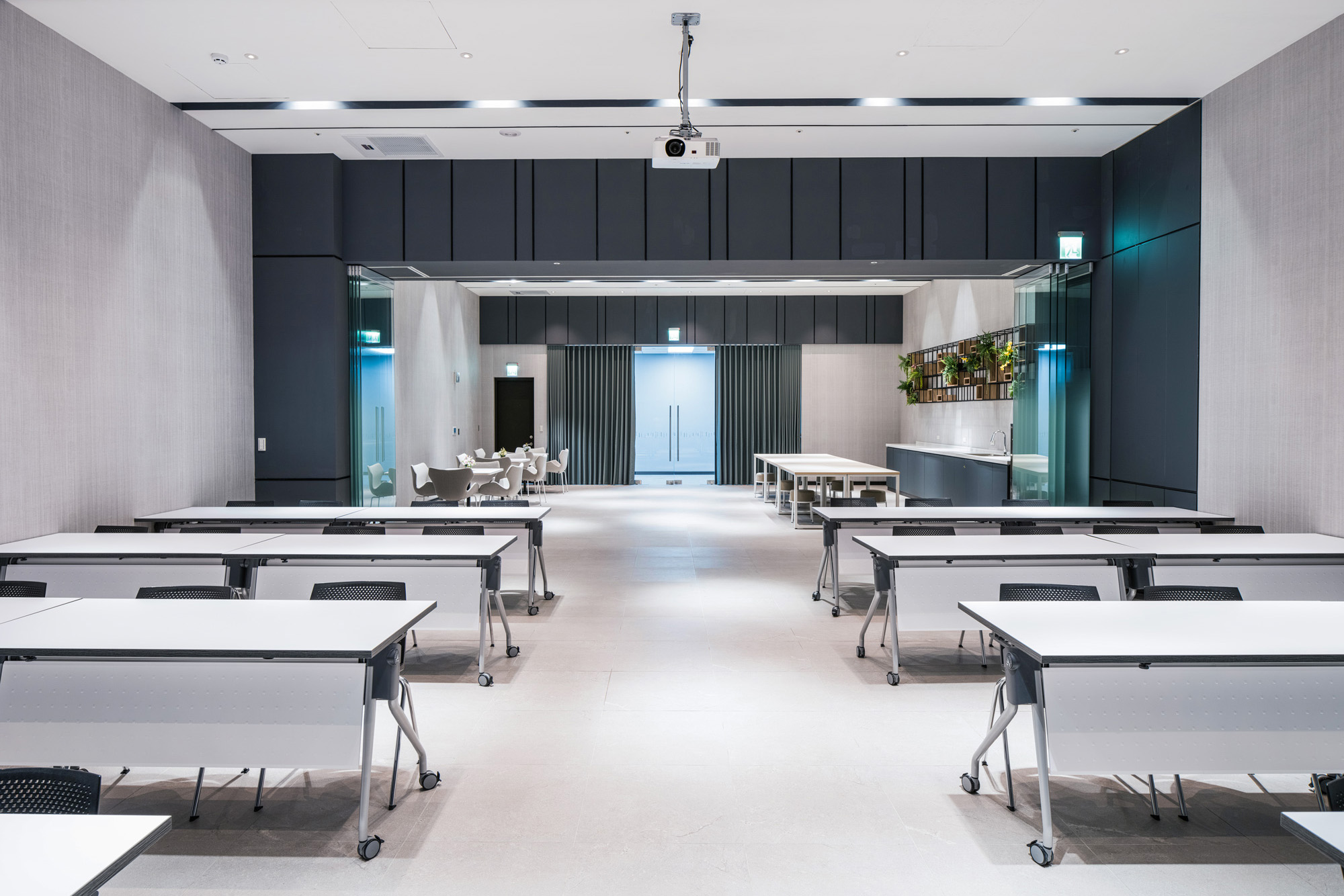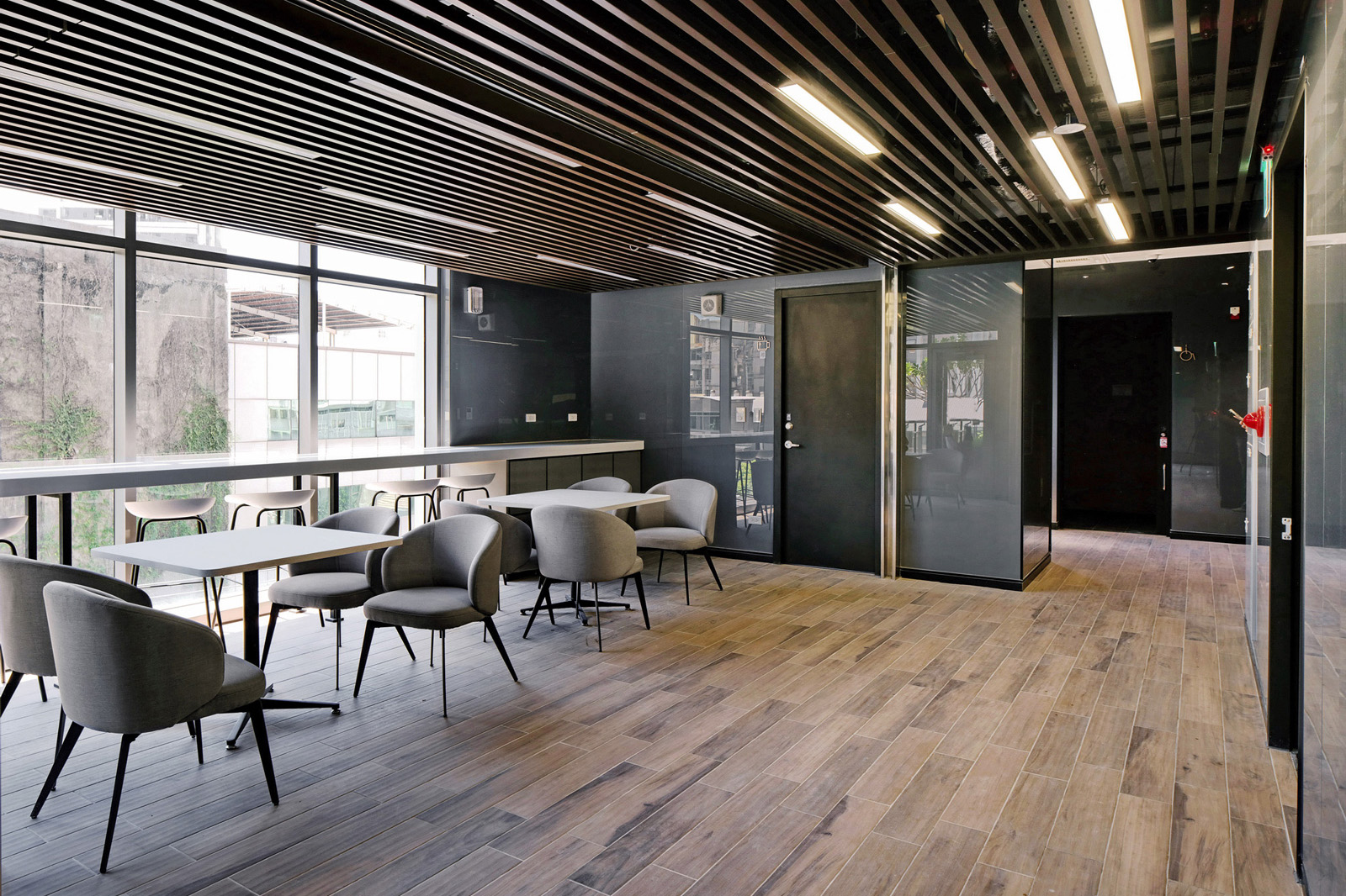 窗邊天花板,則採用金屬鋁板利用反射原理,將室外的水景、綠意引導入內,創造開闊自然的辦公體驗。