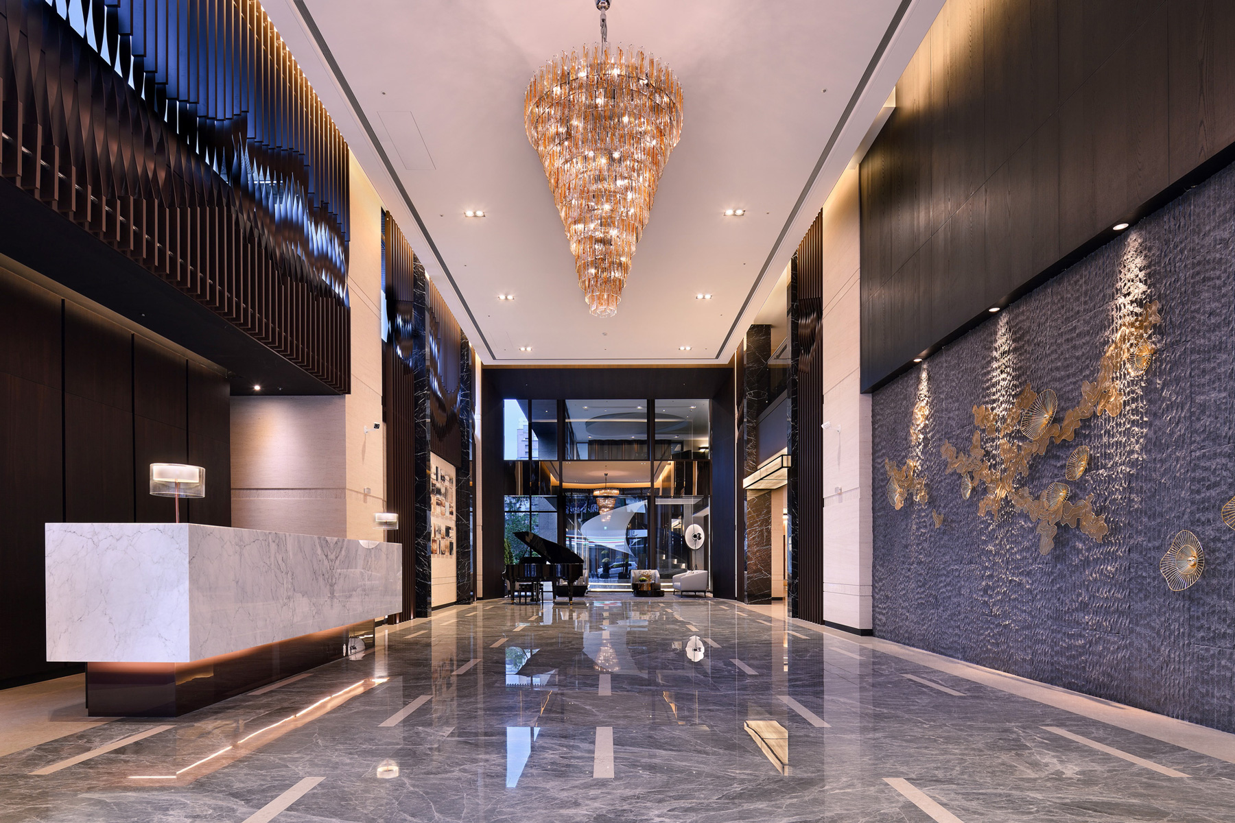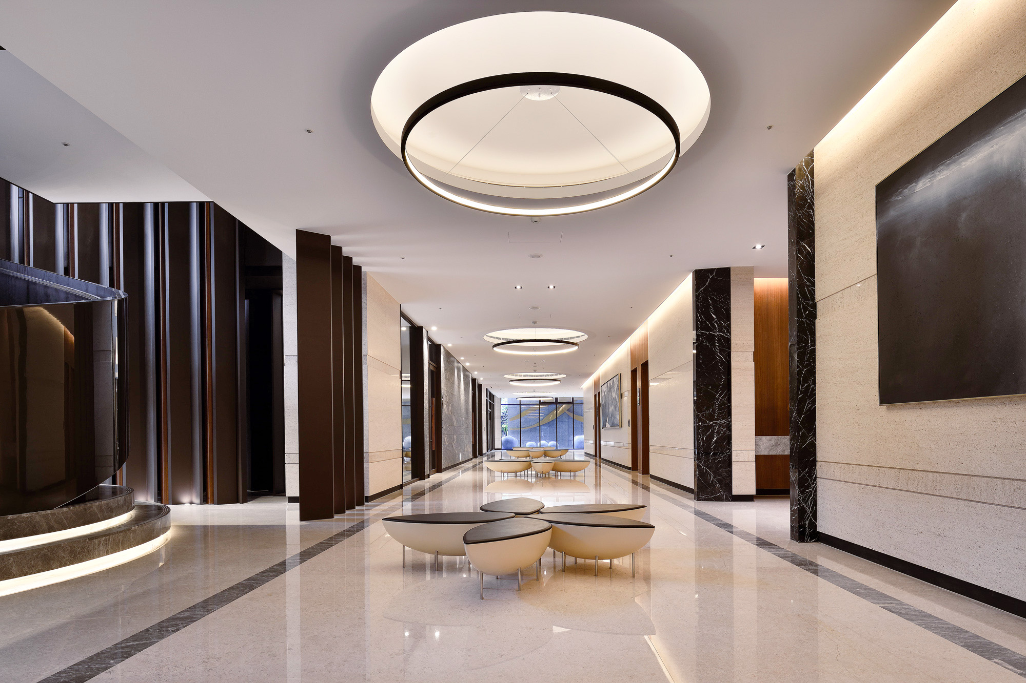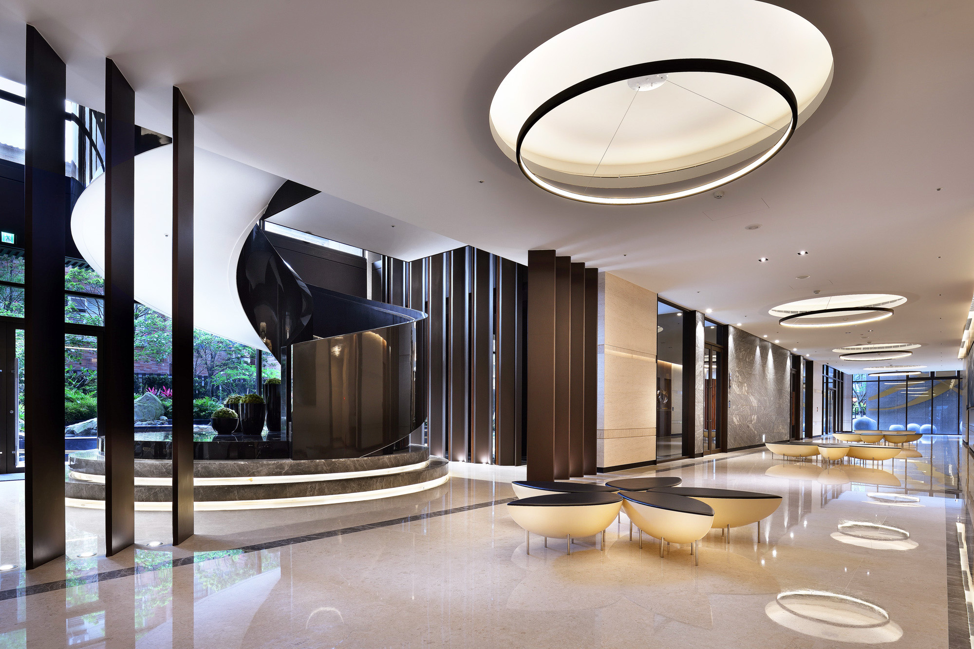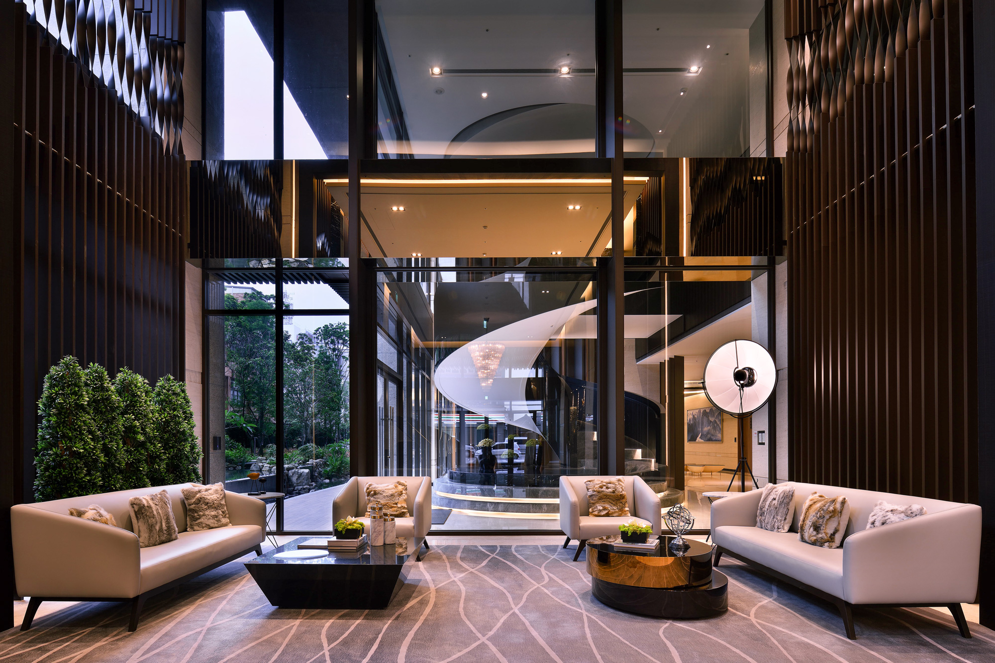 賦都公設空間,環繞「綠色休閒」、「藝術人文」、「時尚都會」三大主軸。行過半戶外休閒沙龍與綠光藝廊,植栽與自然光充盈室內空間,交織自然與生活。調度雕塑手法,將旋轉樓梯轉化為可用空間,內收於行走之間,展現幾何的純粹。大廳的主燈與家具,散發都會豪宅的穩重與大器,回應高端住宅的生活想像。