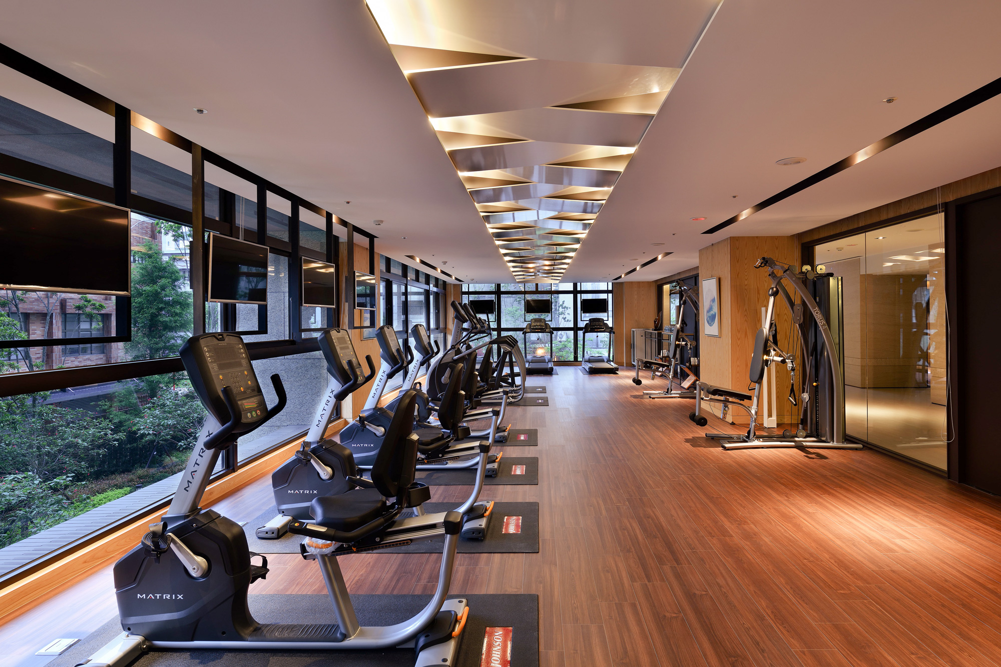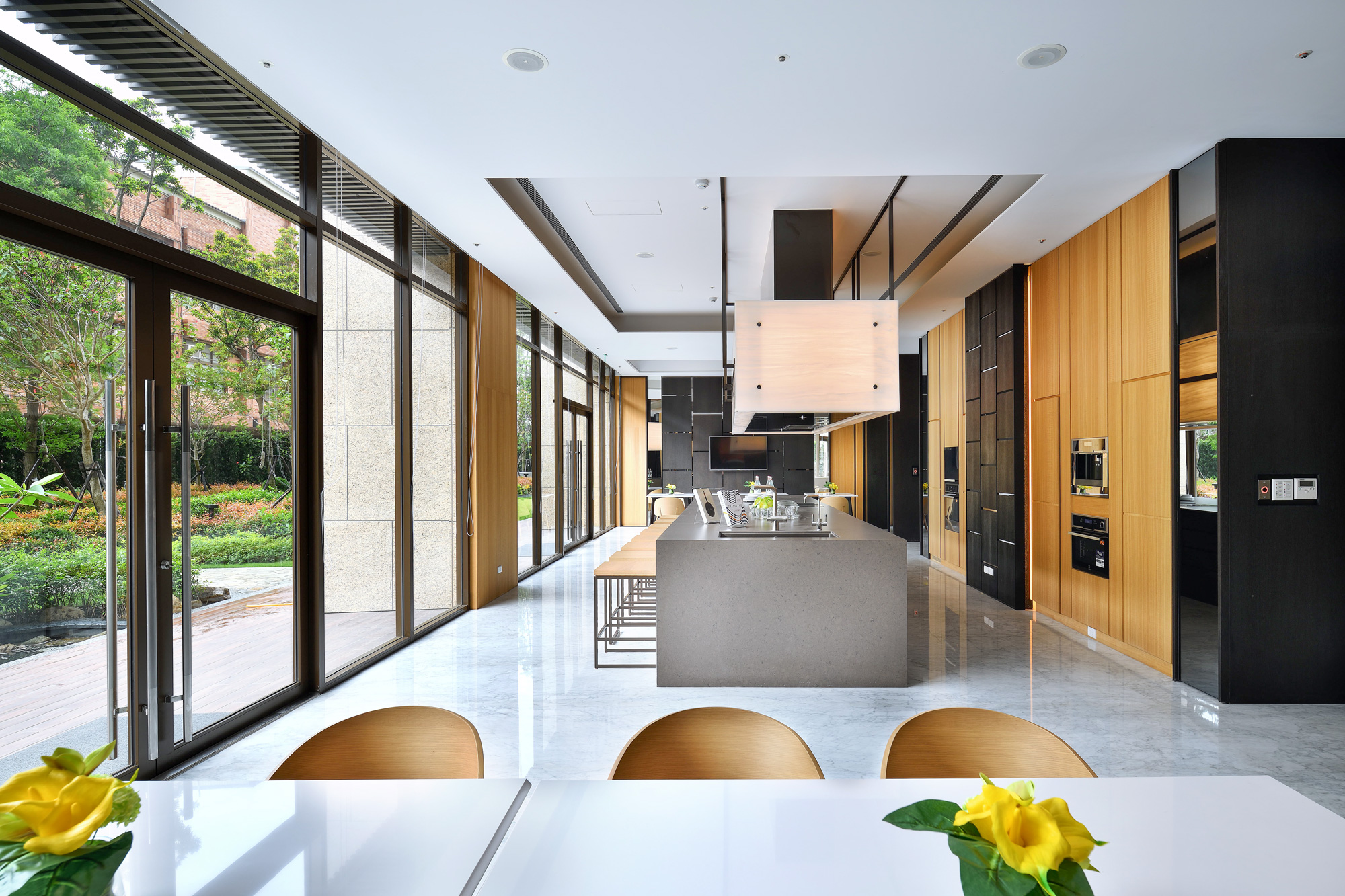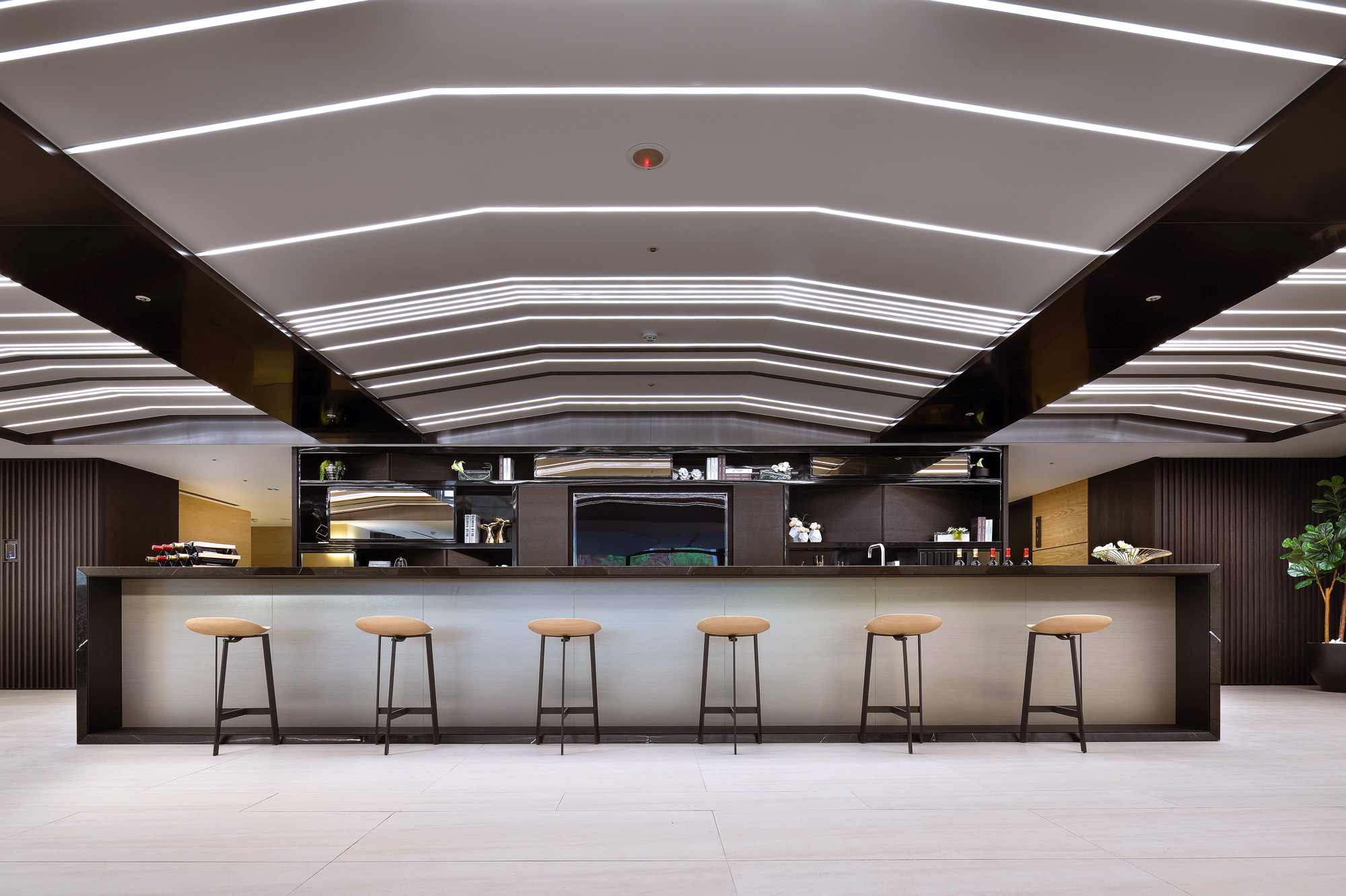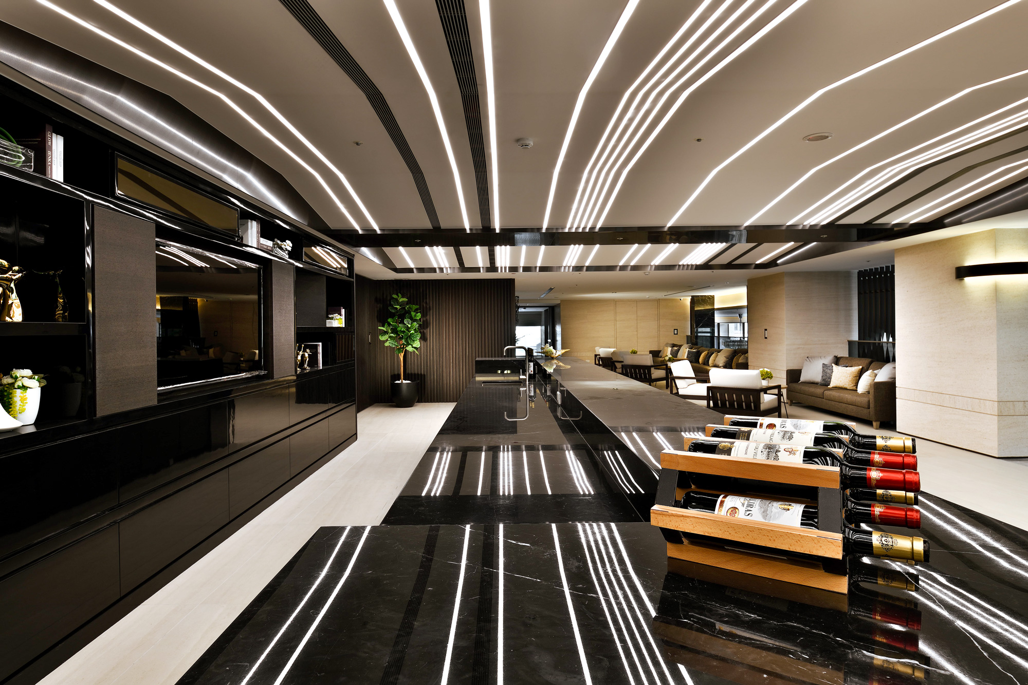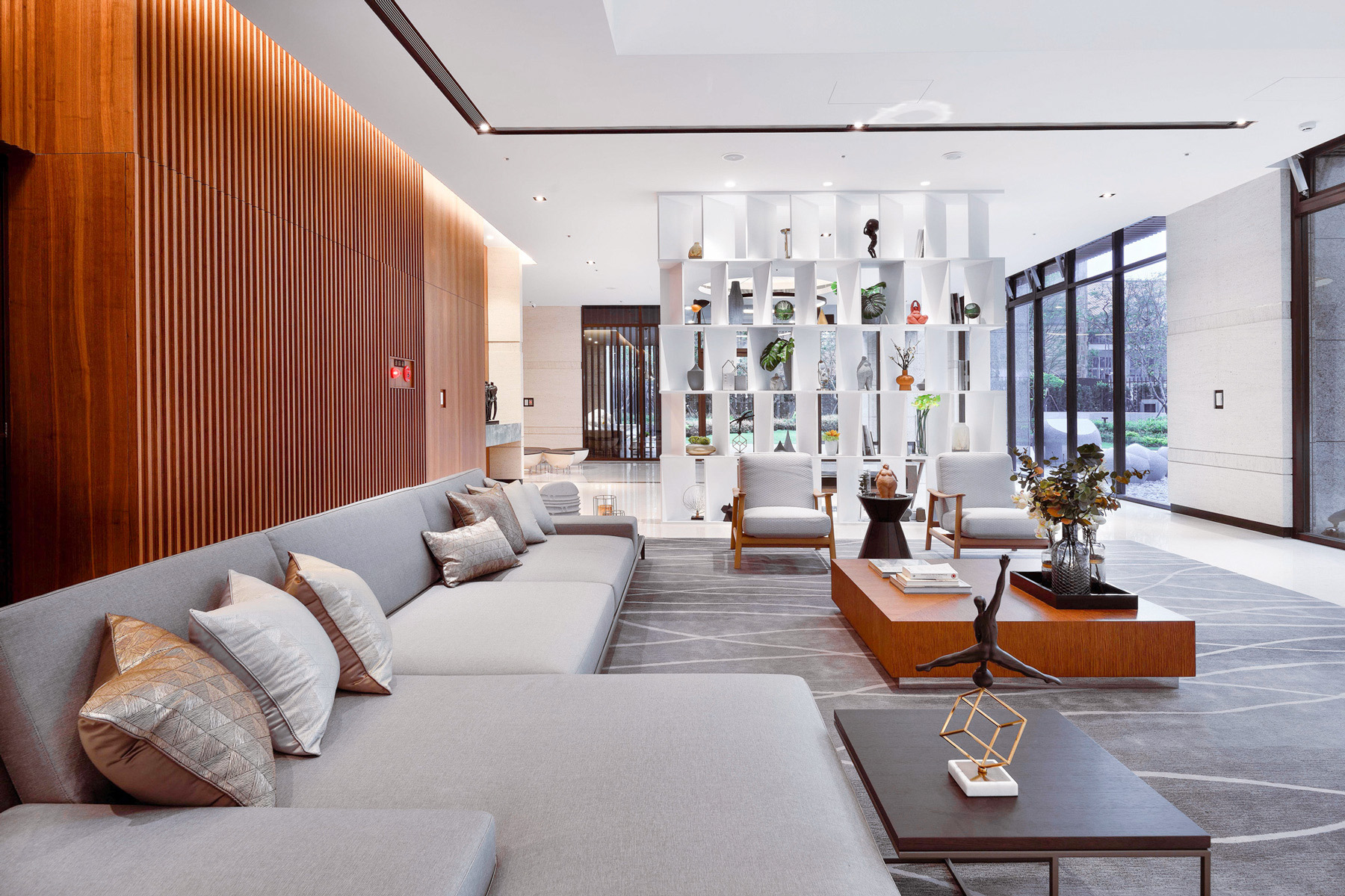 賦都公設空間,環繞「綠色休閒」、「藝術人文」、「時尚都會」三大主軸。行過半戶外休閒沙龍與綠光藝廊,植栽與自然光充盈室內空間,交織自然與生活。調度雕塑手法,將旋轉樓梯轉化為可用空間,內收於行走之間,展現幾何的純粹。大廳的主燈與家具,散發都會豪宅的穩重與大器,回應高端住宅的生活想像。